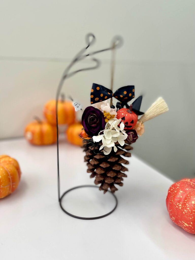 大きな松ぼっくりにプリザーブドフラワーやハロウィンアイテムをアレンジしたコーンオーナメント♬